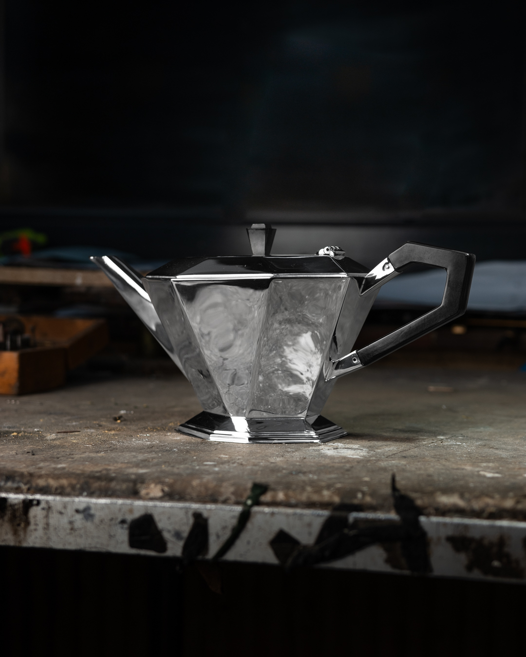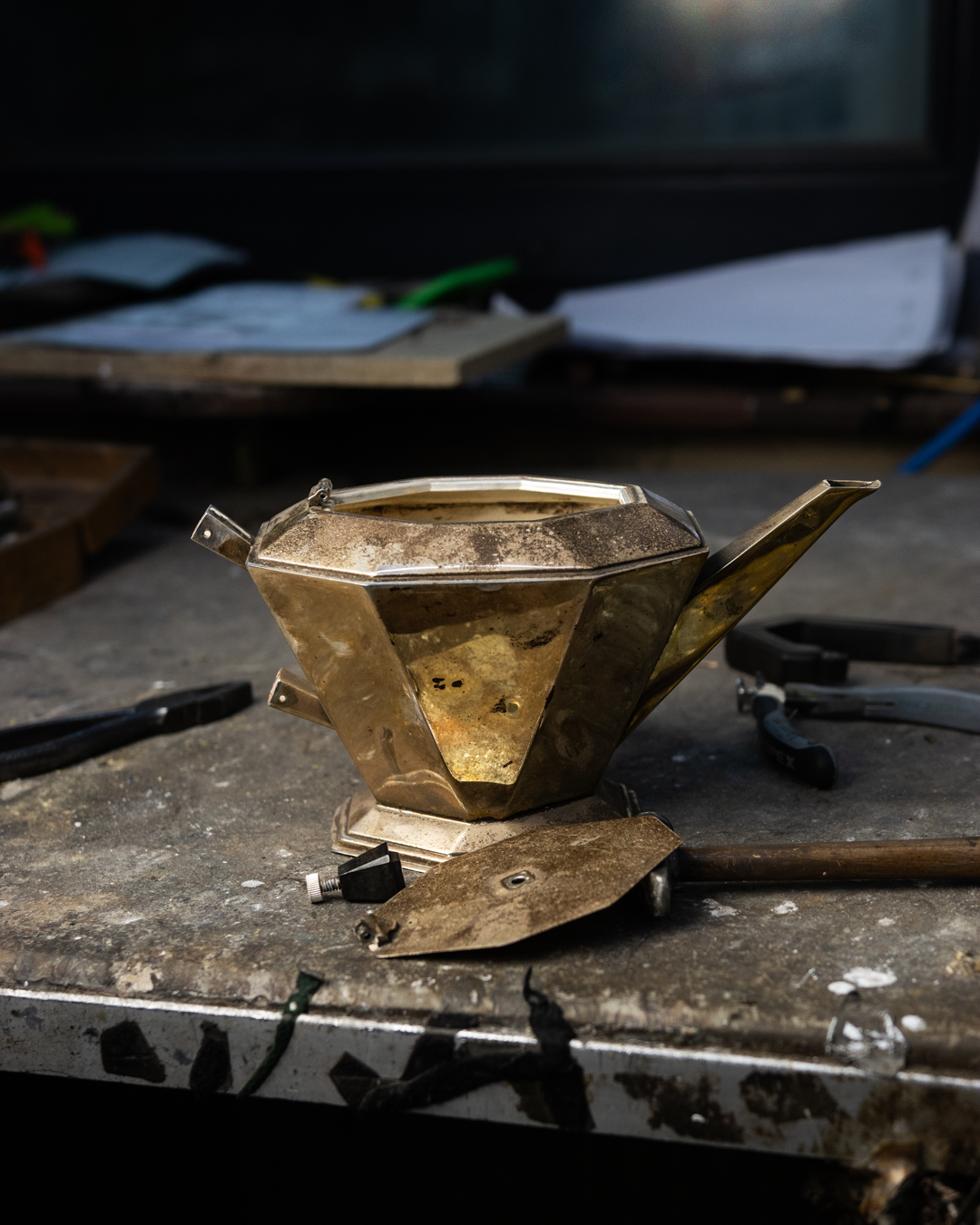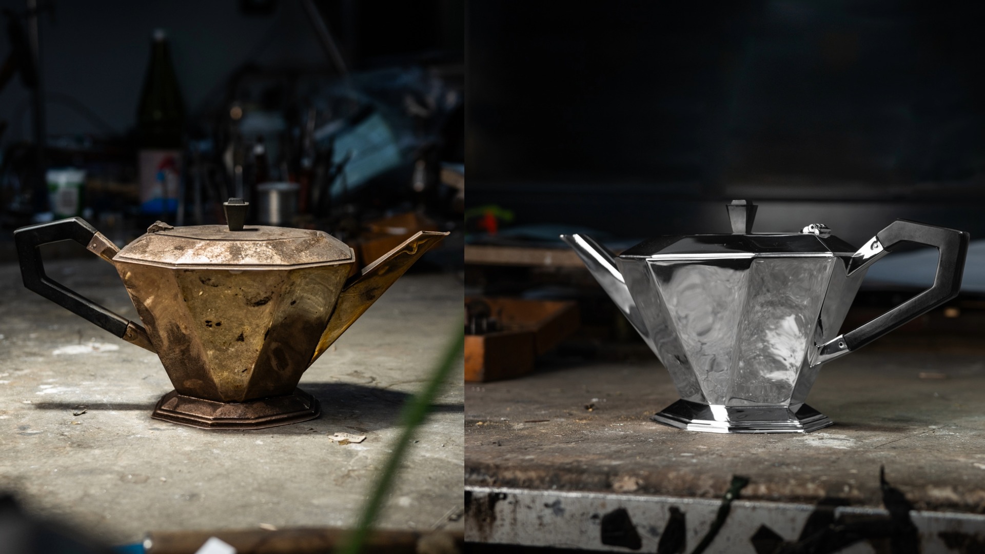 Erst dann folgen die Vorarbeiten an der Außenfläche: Bürsten, Polieren und das Herausarbeiten der ursprünglichen Form. Diese Vorbereitung ist entscheidend, damit die neue Silberschicht später gleichmäßig haften kann und den Glanz erhält, den eine hochwertige Teekanne verdient.