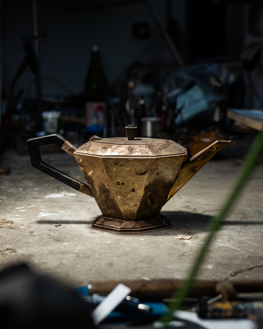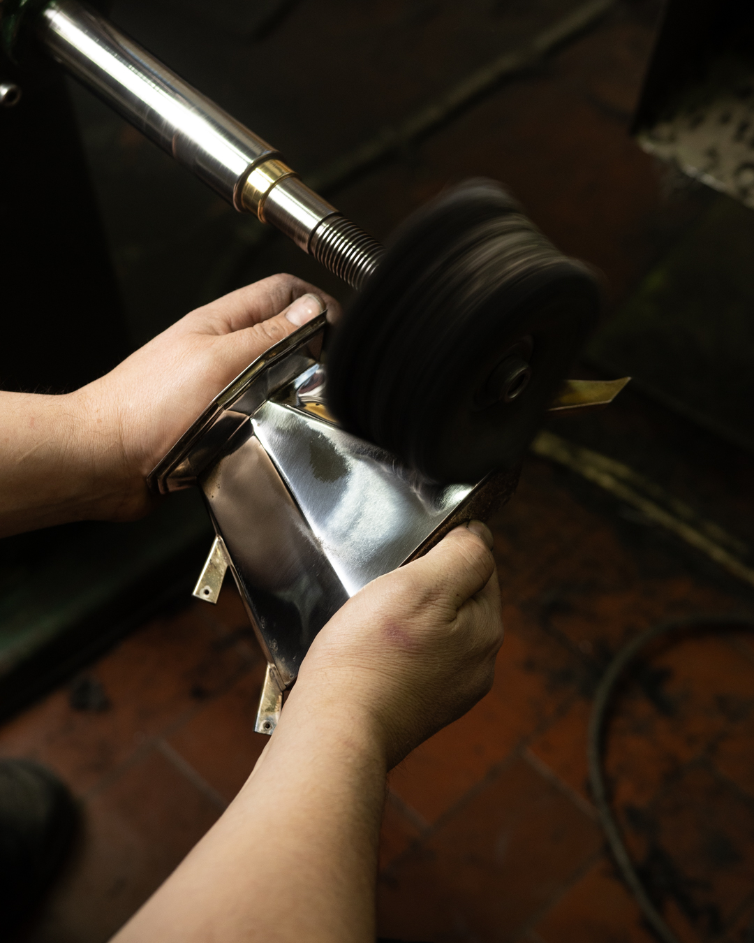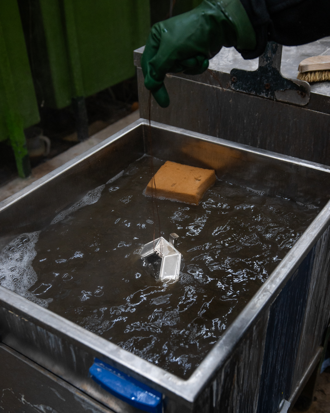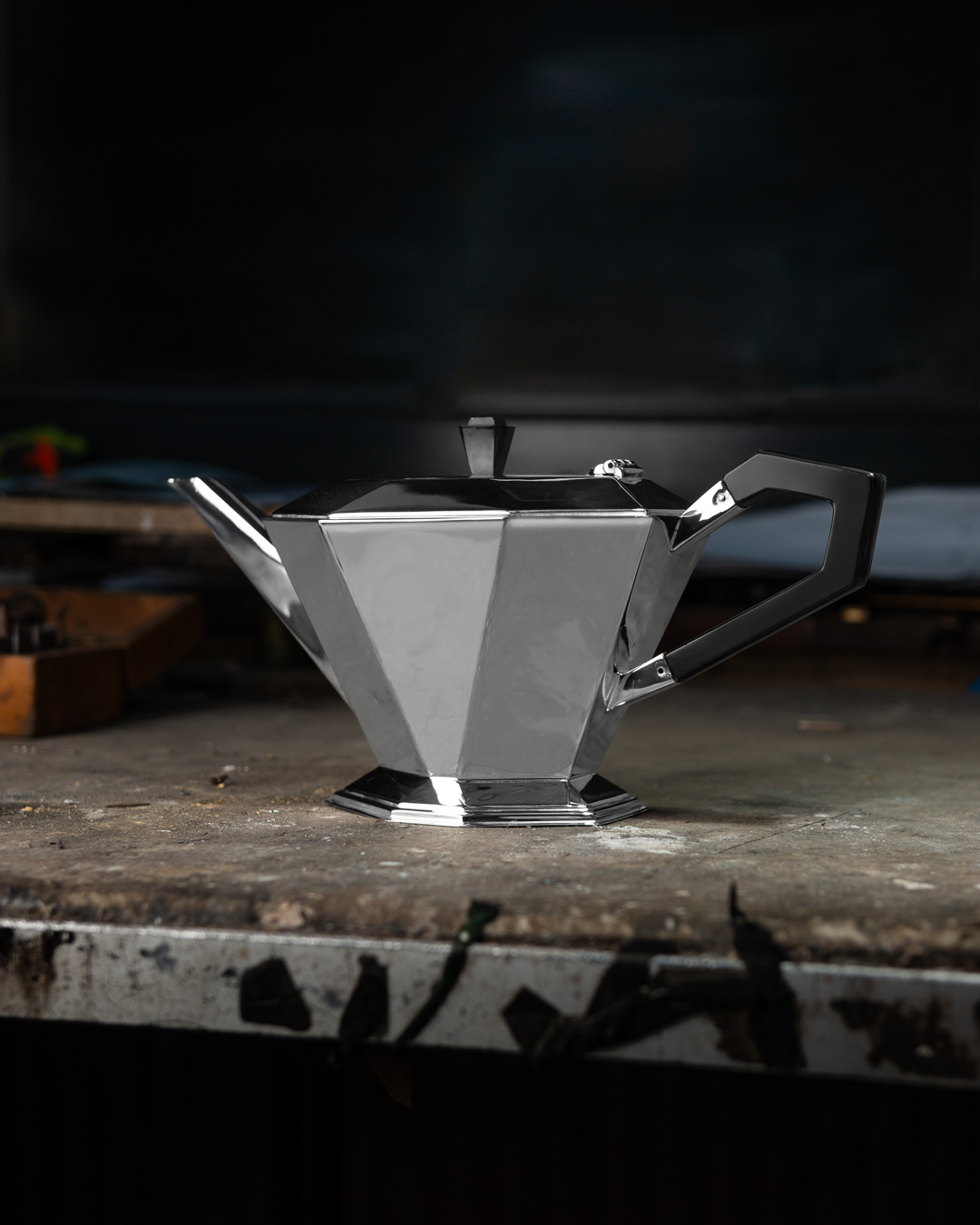 Erst dann folgen die Vorarbeiten an der Außenfläche: Bürsten, Polieren und das Herausarbeiten der ursprünglichen Form. Diese Vorbereitung ist entscheidend, damit die neue Silberschicht später gleichmäßig haften kann und den Glanz erhält, den eine hochwertige Teekanne verdient.