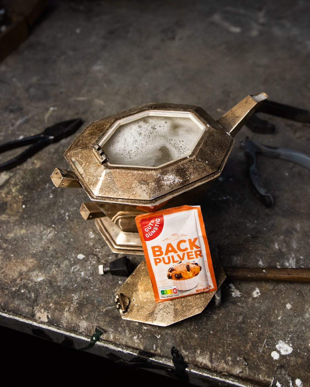 Die Restaurierung beginnt mit der behutsamen Demontage von Griff und Isolierhölzern. Nur so lassen sich alle Bereiche der Kanne vollständig erreichen und später wieder sauber montieren. Im Anschluss widmen wir uns der Innenreinigung, die wir besonders schonend durchführen. Dabei kommt – abhängig vom Zustand – teilweise auch Backpulver zum Einsatz. Welche Mittel sich für die private Anwendung eignen, erläutern wir ausführlich in unserem Beitrag „So reinigst du deine Teekanne aus Silber selbst“.