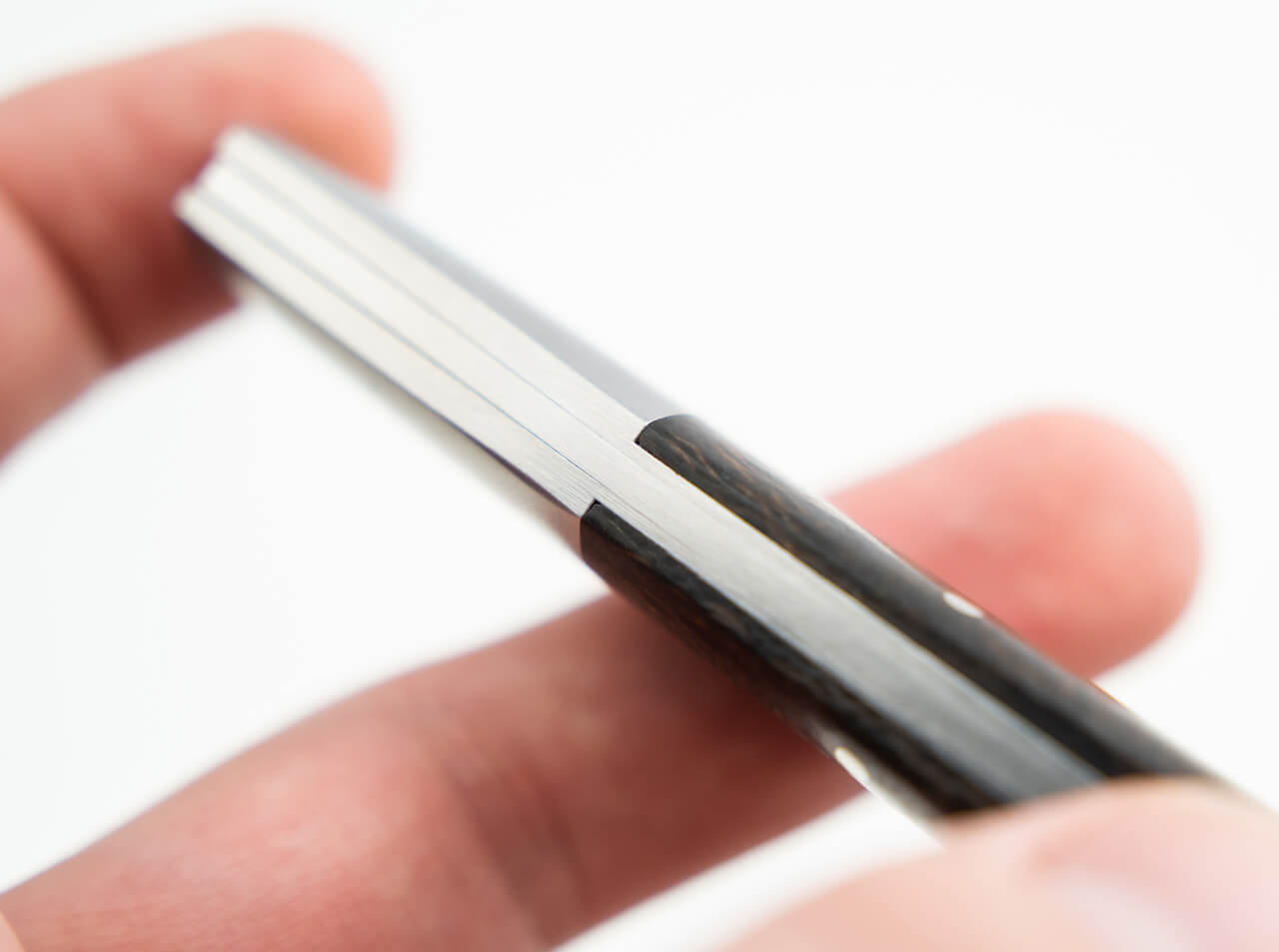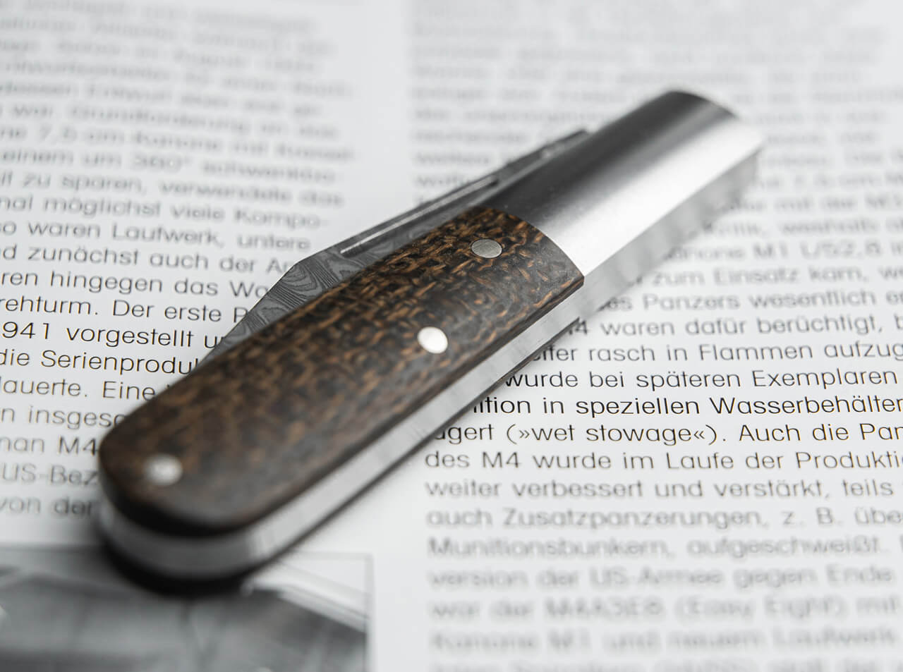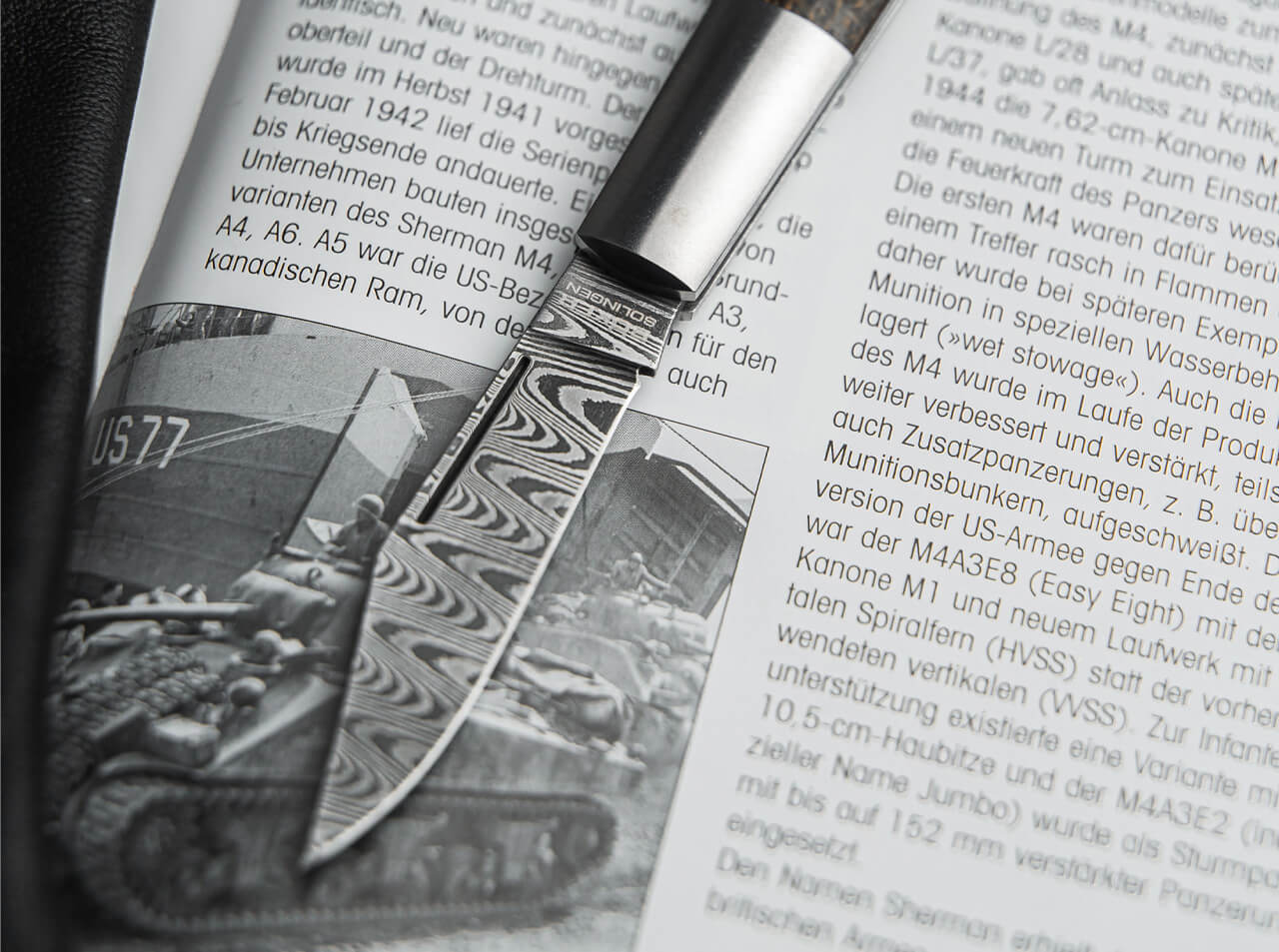 - der Damast aus 80 Lagen erinnert an Panzerspuren (von Hand von Chad Nichols im Muster Customized Ladder geschmiedet)