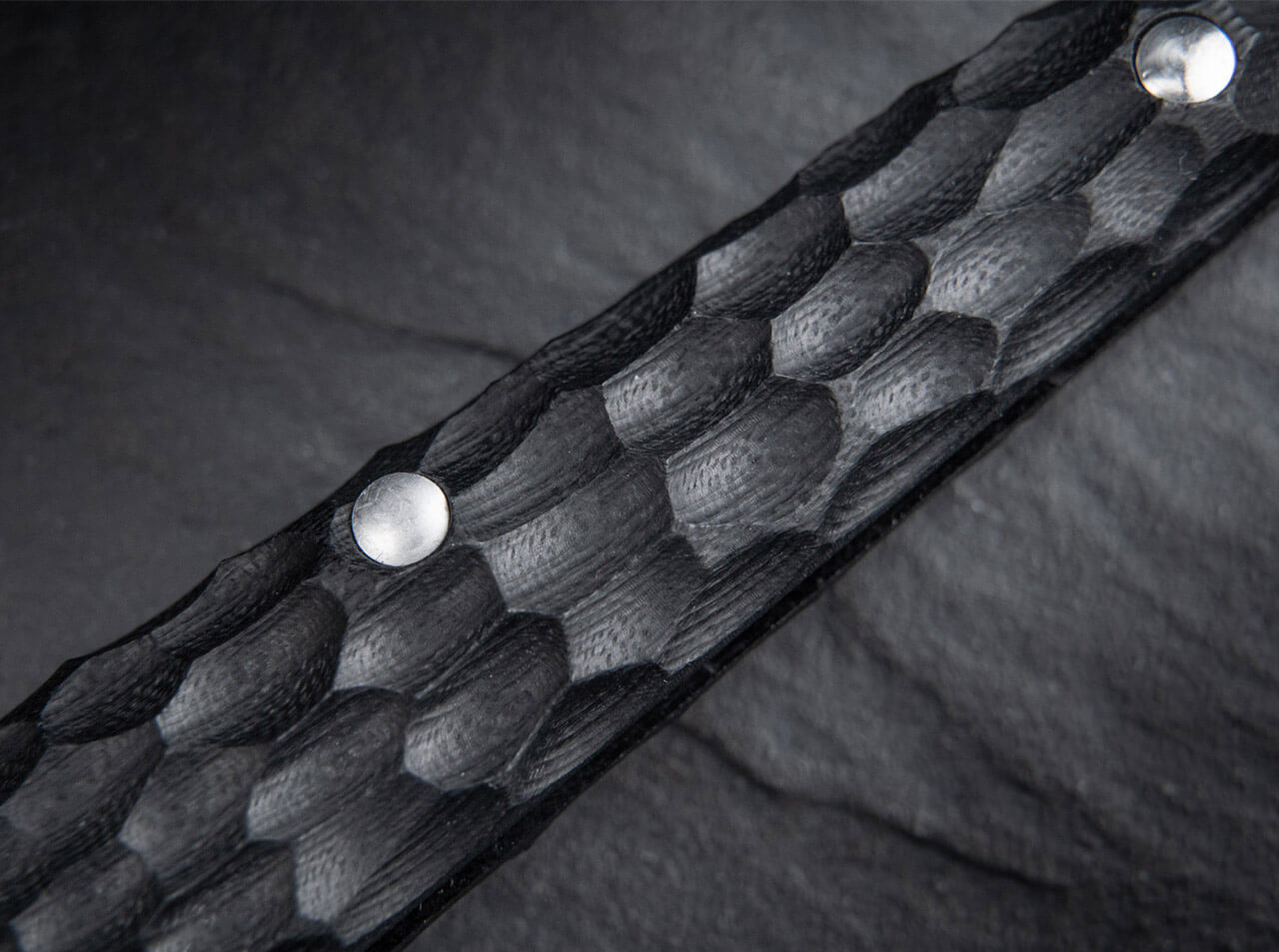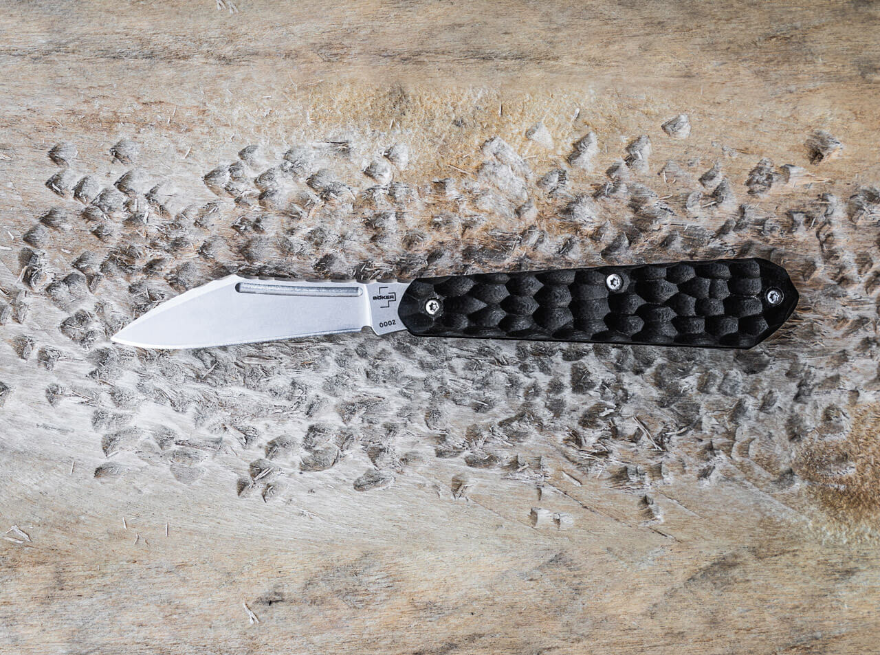 Das Koteyka ist ein Design des ukrainischen Messermachers Alexander Krava. Der Name entstammt der Nerd-Szene und bezieht sich auf ein Computer-Virus mit einer Katze als Symbol. Dieses Slipjoint Taschenmesser kommt mit einem aufwendig 3D gefrästen Griff aus schwarzem G10 und einer Klinge aus D2-Stahl. Die Besonderheit ist, dass sich die Textur der Griffschalen auf dem Klingenrücken fortsetzt, was dem Messer einen ganz eigenen Charme verleiht. Der lange, leicht geschwungene Nagelhau lässt dich dieses 42a-konformeTaschenmesser bequem zweihändig öffnen.