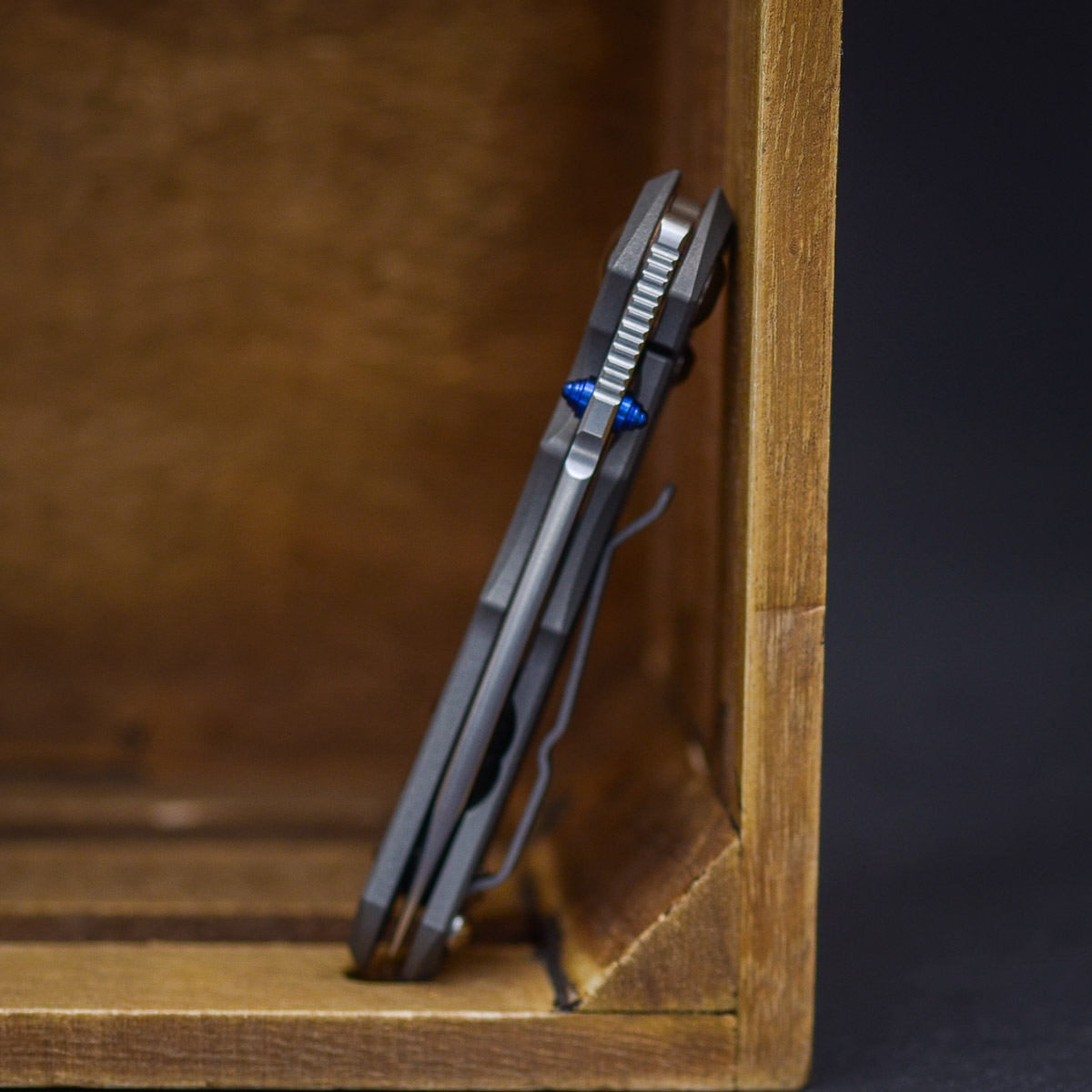 The most striking innovation can be found on the handle. Here are two pronounced finger recesses that give your hand a more secure grip when working with the knife and give you more control in the cutting movement. The lock is still the Integral Lock invented by Chris Reeve, which has been improved by a decisive detail in the Inkosi. In order to prevent the softer titanium from coming into direct contact with the blade's hardened CMP S45VN steel, the detent ball (which is made of an extremely hard ceramic) was placed in such a way that it also serves as a contact point for the lock. This eliminates the possibility of wear and tear on the titanium.