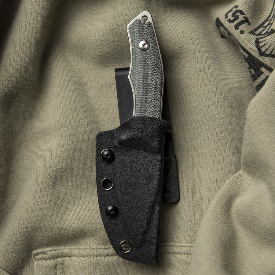 - Compact fixed with kydex sheath and belt adapter for both horizontal and vertical carry