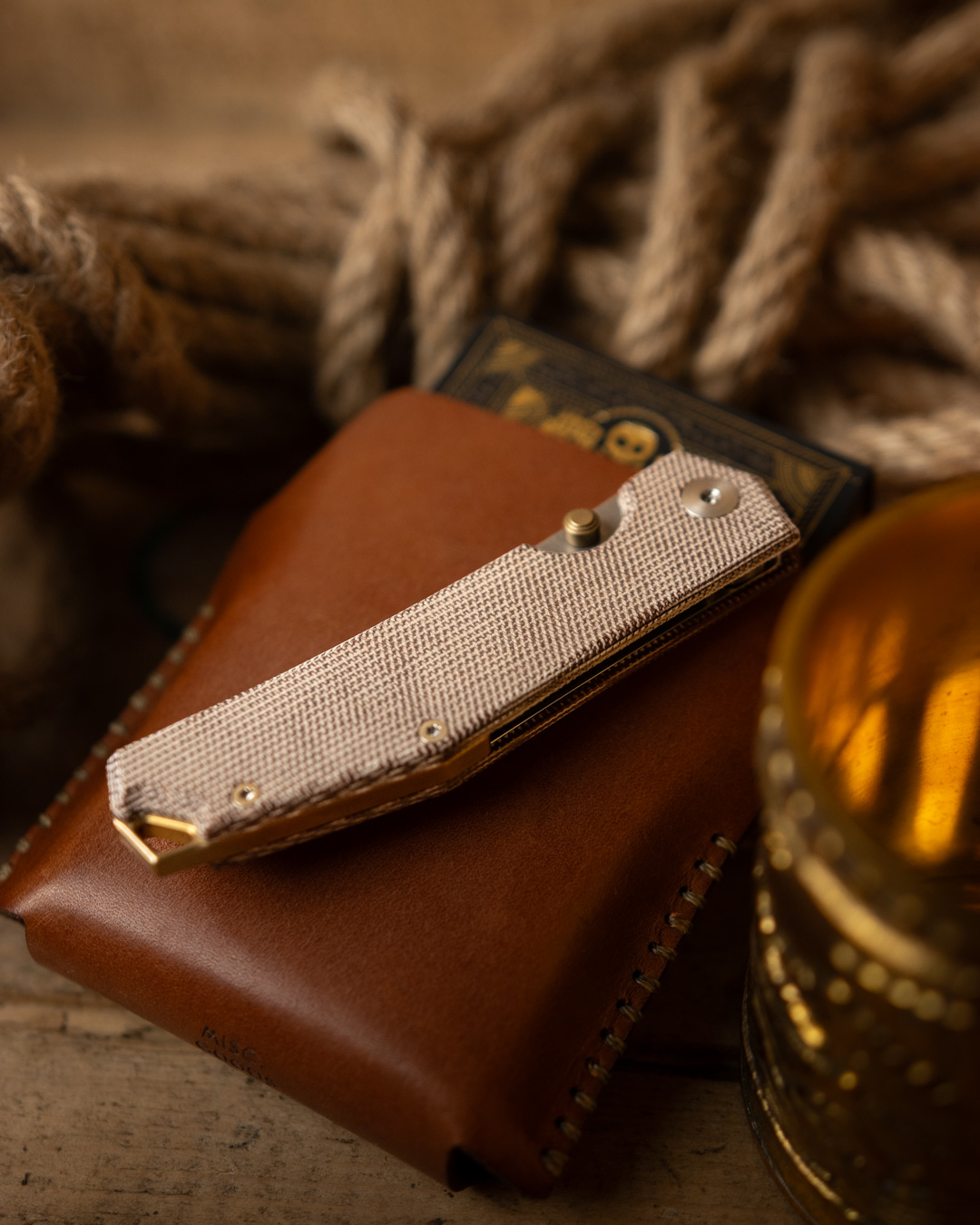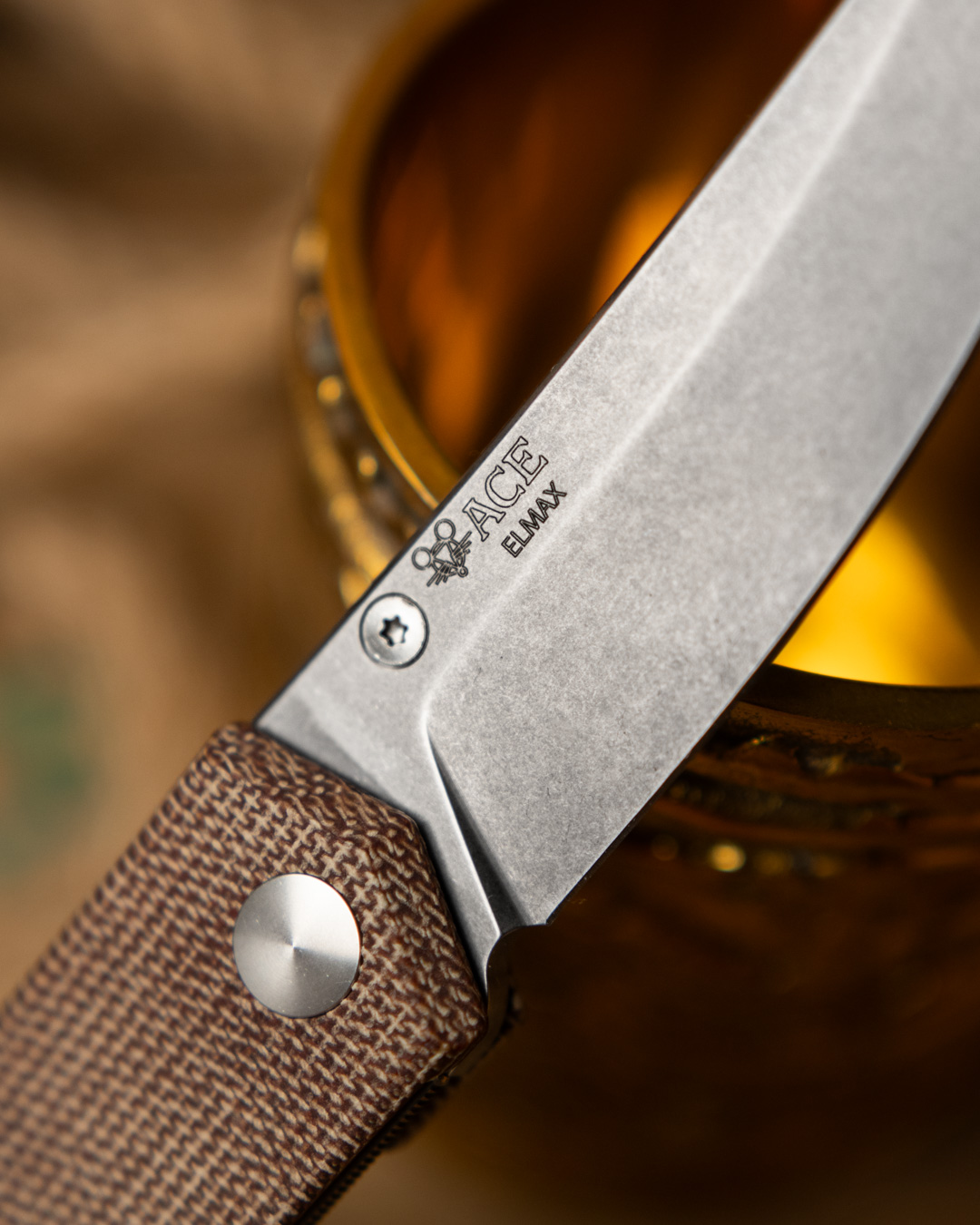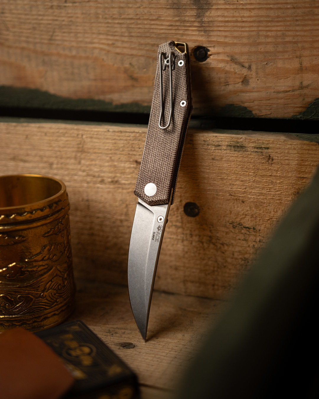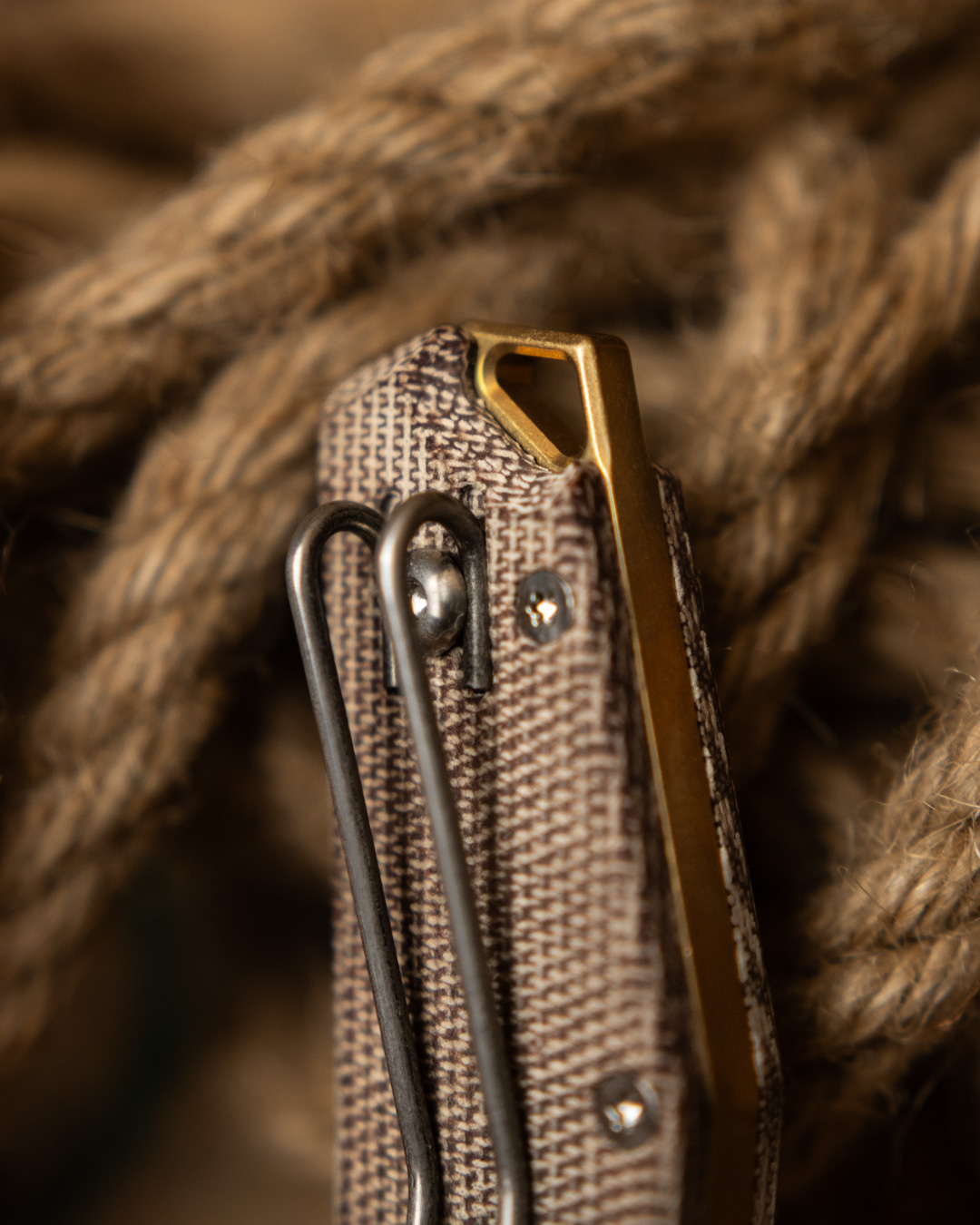 The handle is with equipped with natural brown Micarta scales and a black backspacer/thumb pin, which gives the knife a certain old-school charm and looks simply fabulous. The shape of the handle may remind you a bit of the classic Scandinavian Pukkos, but without copying them. The slightly sloping shape towards the back offers a great hand position, which makes this compact pocket knife very universal. Thanks to the generous recess in the handle, the liner lock is easy to unlock and very easy to use.