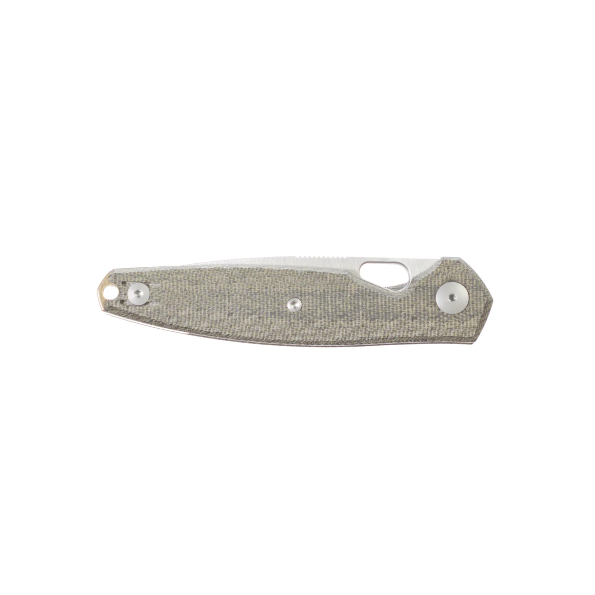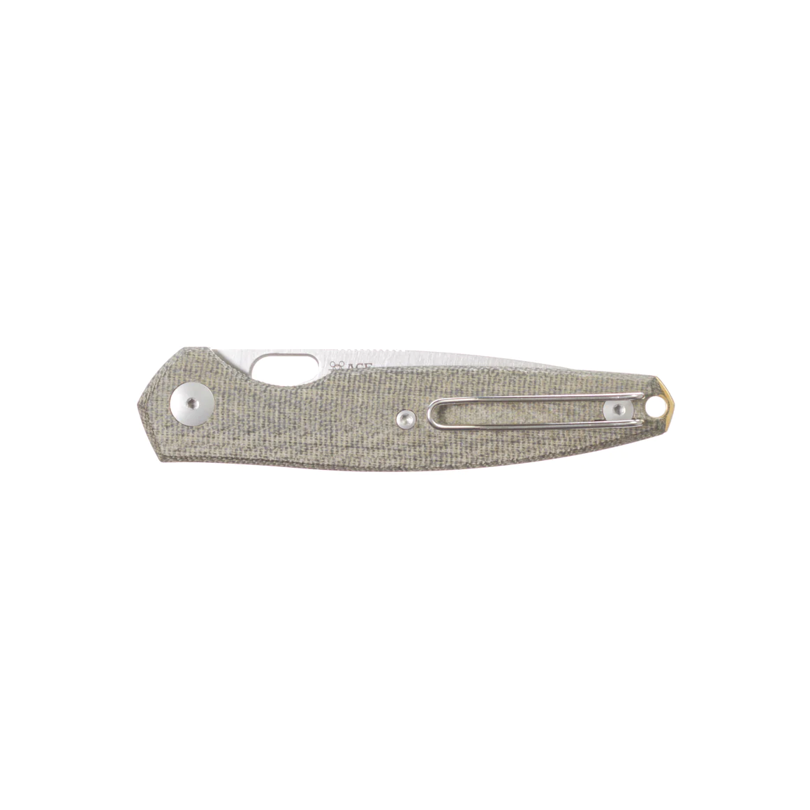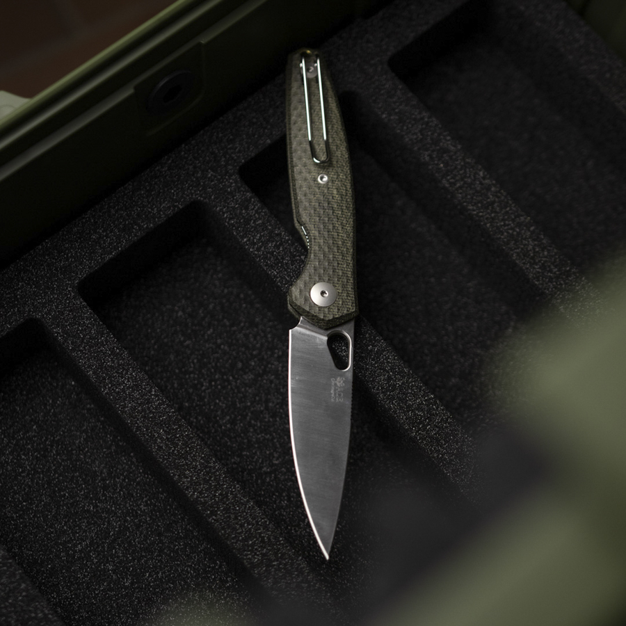 - Grip in textured G10 or Micarta