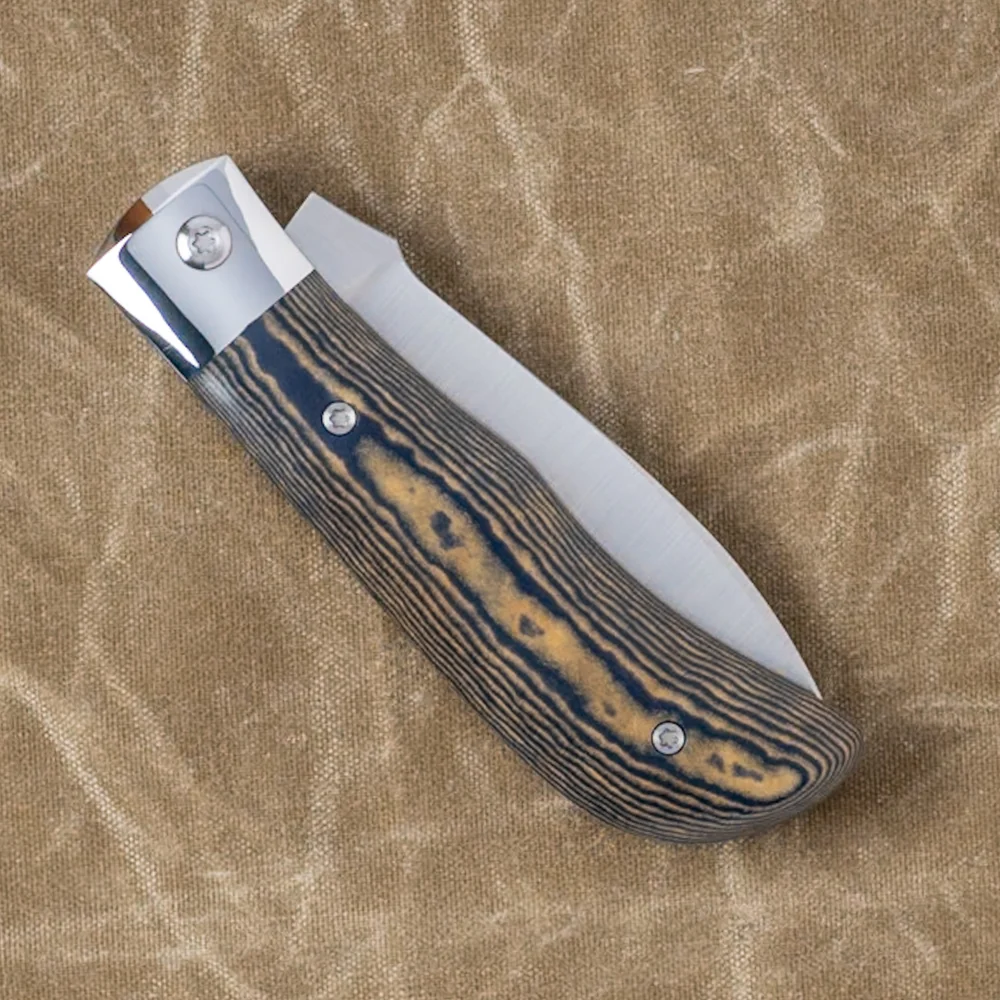 Zum ersten Mal setzt Jack Wolf Knives hier auf eine 4 mm starke Klinge – mehr Rücken ist im klassischen Slipjoint-Format kaum denkbar. Dazu kommt ein hervorragend umgesetzter Longpull mit leichter Krümmung, perfekt an den Klingenrücken angepasst. Praktisch, ergonomisch und gleichzeitig einfach verdammt gut gemacht. Die Klinge besteht aus 154CM-Stahl, also genau dem bewährten Stahl, den man von einem zuverlässigen Arbeitsmesser erwartet.